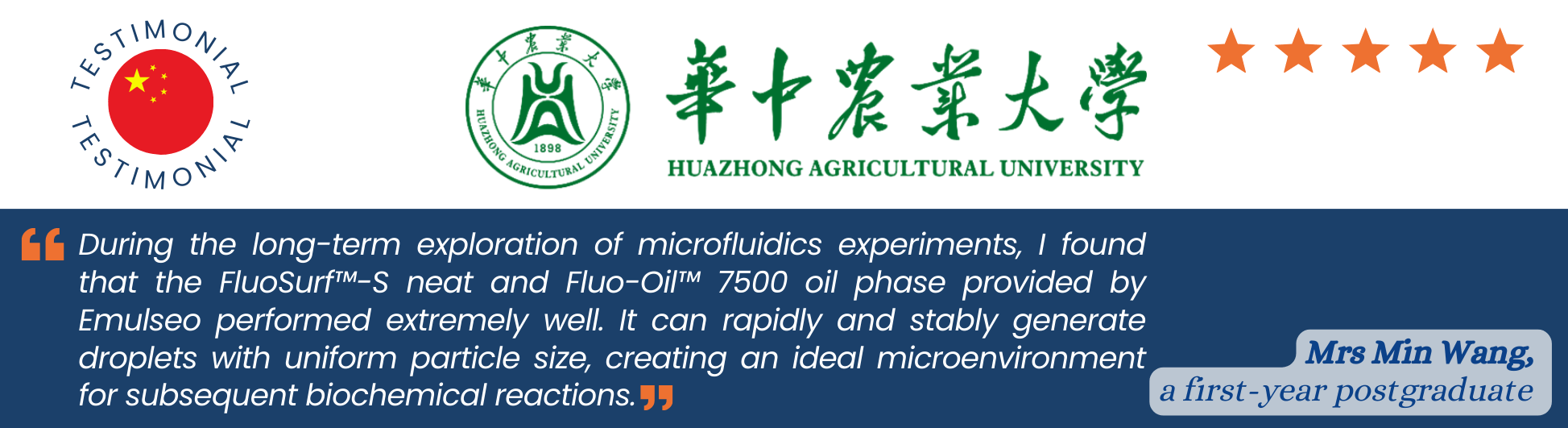 As China continues to drive innovation in microfluidics, Emulseo is proud to support students, scientists, and institutions committed to pushing the boundaries of science. Mrs. Min Wang, a first-year postgraduate student at 华中农业大学 (Huazhong Agricultural University), shared her experience with our surfactant and oil formulations during her microfluidic research: “During the long-term exploration of microfluidics experiments, I found that the FluoSurf™-S neat and Fluo-Oil™ 7500 oil phase provided by Emulseo performed extremely well. It can rapidly and stably generate droplets with uniform particle size, creating an ideal microenvironment for subsequent biochemical reactions.” Consistent droplet generation is essential for reproducible microfluidic workflows, especially when conducting sensitive biochemical reactions or screening protocols. Min Wang’s feedback highlights exactly what we aim to provide: stability, control, and trust at every stage of the experiment. We are especially grateful to the many Chinese researchers, from early-career scientists to established leaders, who choose Emulseo as part of their experimental journey. Your confidence motivates us to keep improving and to deepen our collaborations throughout China. Thank you, Mrs. Wang, and thank you to the wider Chinese microfluidics community for your growing trust.